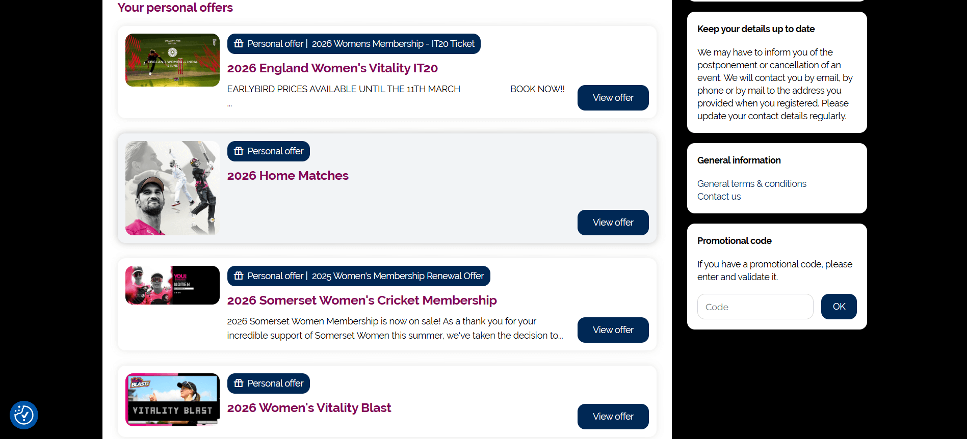 Somerset Women guest passes will appear separately in “Your Personal Offers” and you can simply select either Vitality Blast or Metro Bank One Day Cup.