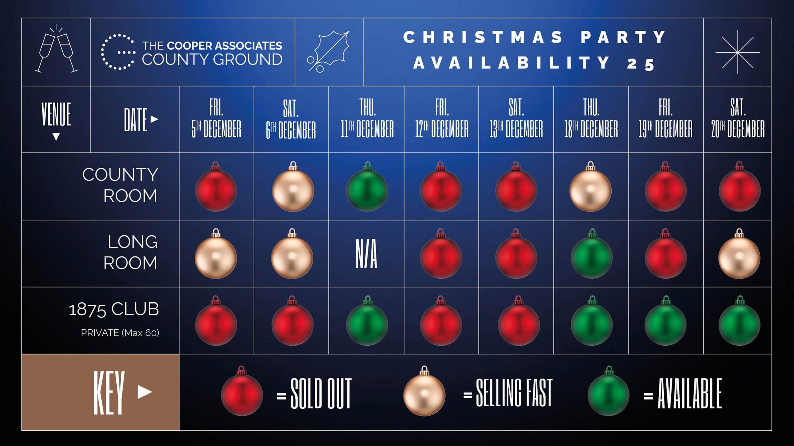 The Cooper Associates County Ground still has limited availability for 2025, so book with us and ensure a brilliant festive night to remember!