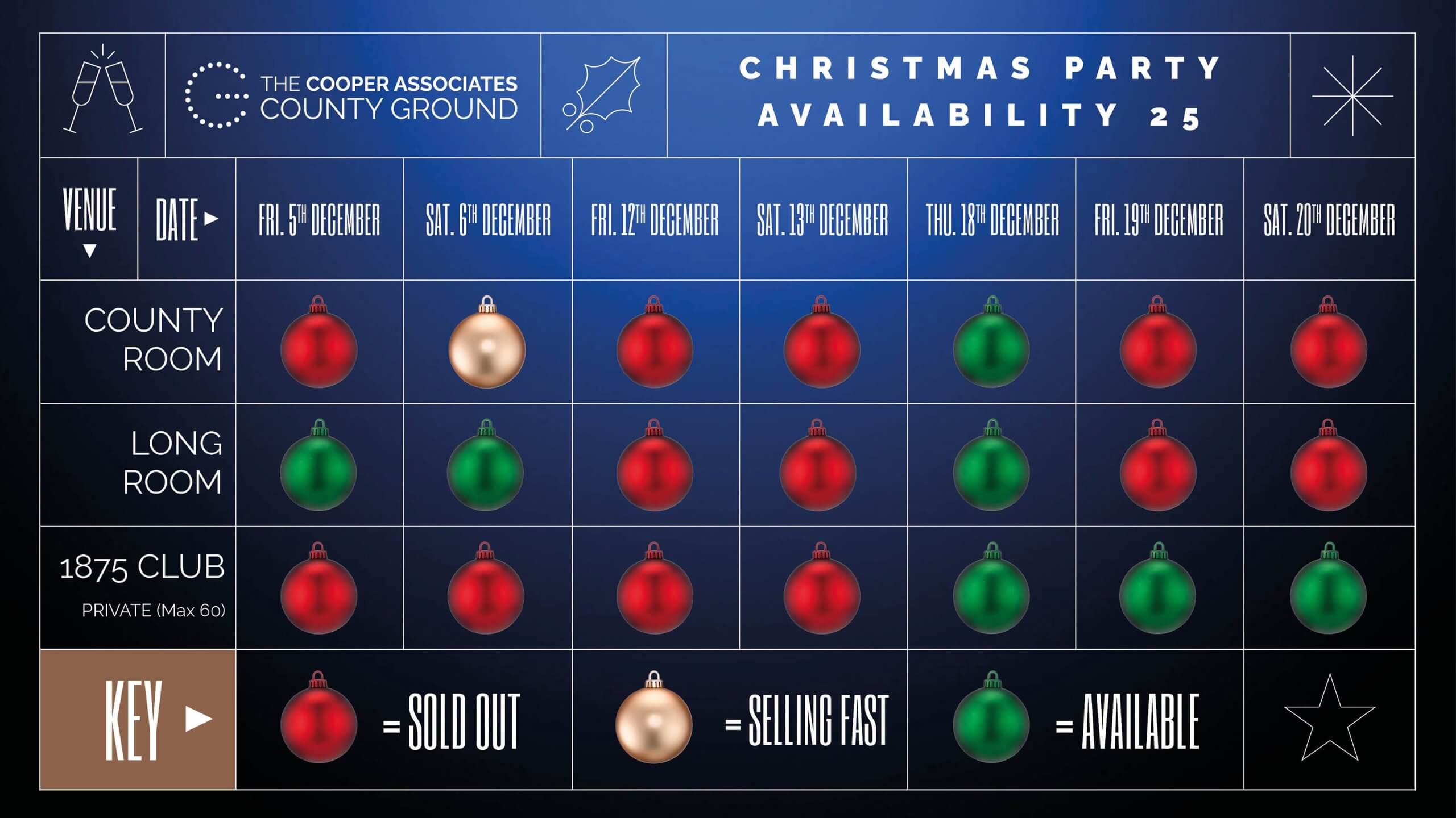 From traditional Christmas party nights to exclusive festive gatherings, the Cooper Associates County Ground gives you: