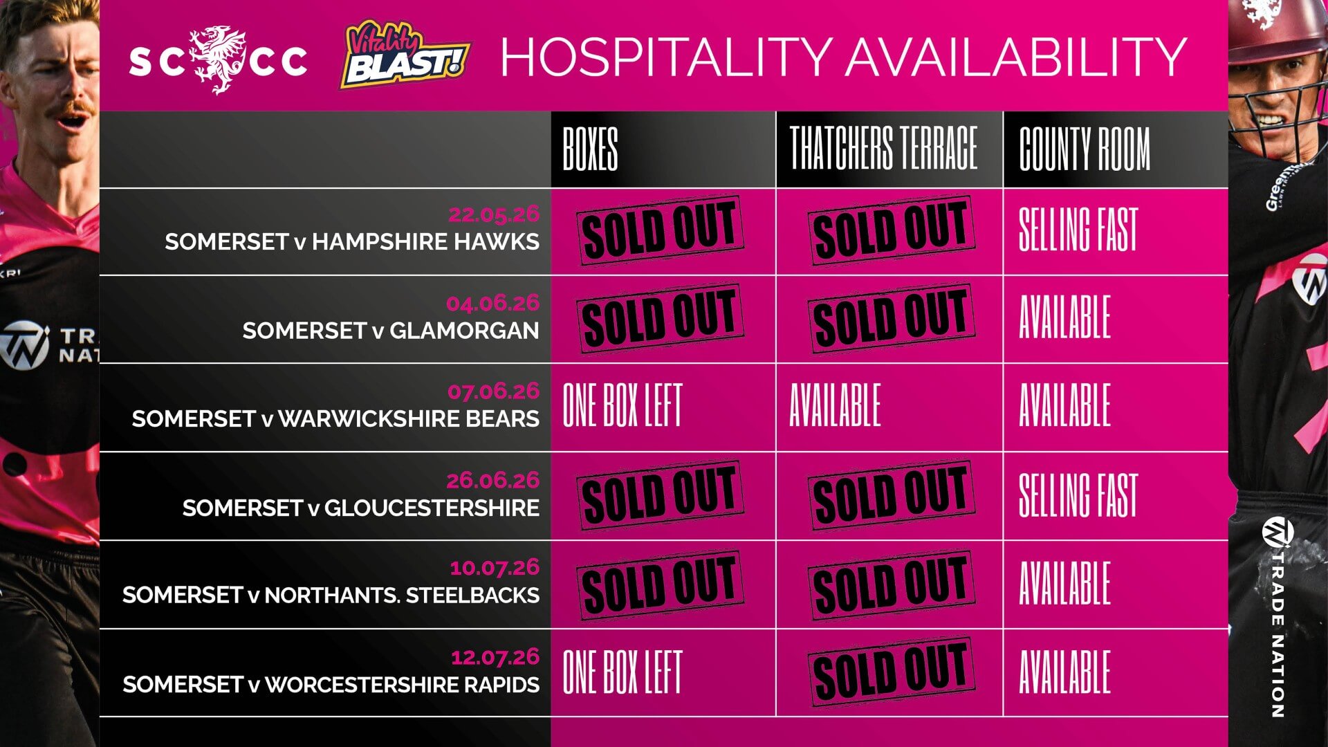 We only have two matchday boxes left for the Vitality Blast, but don’t despair; we have a number of alternative hospitality options available which will allow you to enjoy the action in style!