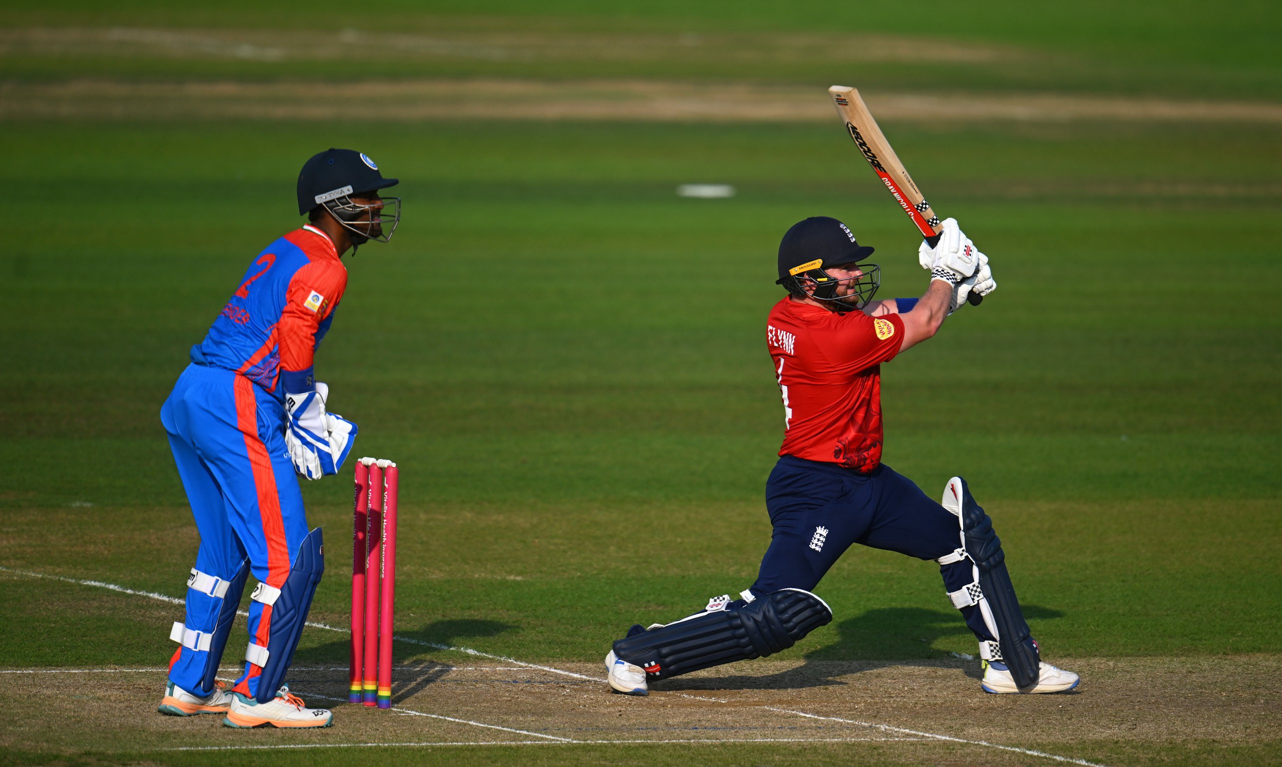 Callum Flynn and Liam O’Brien brought up the England 100 in the 13th over and the pair both reached their half centuries, O’Brien from 26 balls and Flynn from 34, as England looked to set a sizable total.