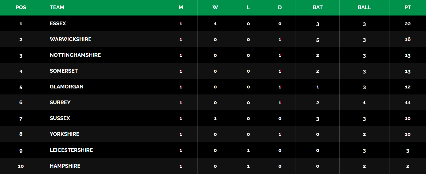After the opening round of fixtures Somerset are joint third in the Rothesay County Championship First Division with 13 points whilst Essex currently top the table with 22 points.