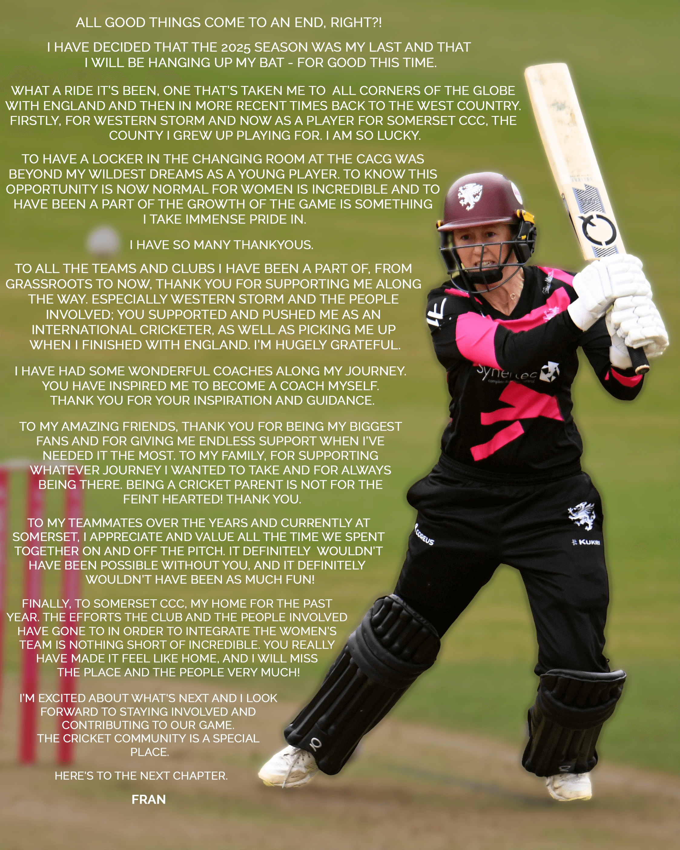 Regarding her decision, Fran said: “I have decided that the 2025 season was my last and that I will be hanging up my bat – for good this time.